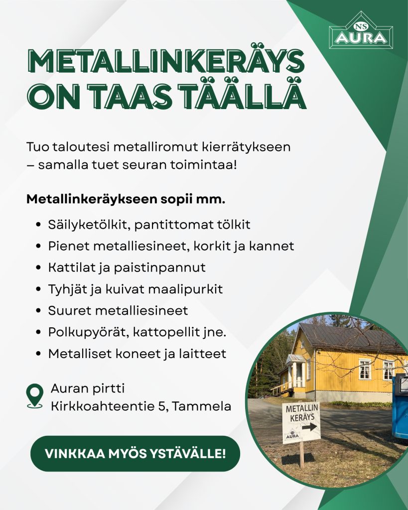 Nyt on hyvä hetki siivota varastot, autotallit ja pihannurkat – kaikki metalliromu kiertoon! Keräyksen tuotot menevät suoraan seuran toiminnan tukemiseen.